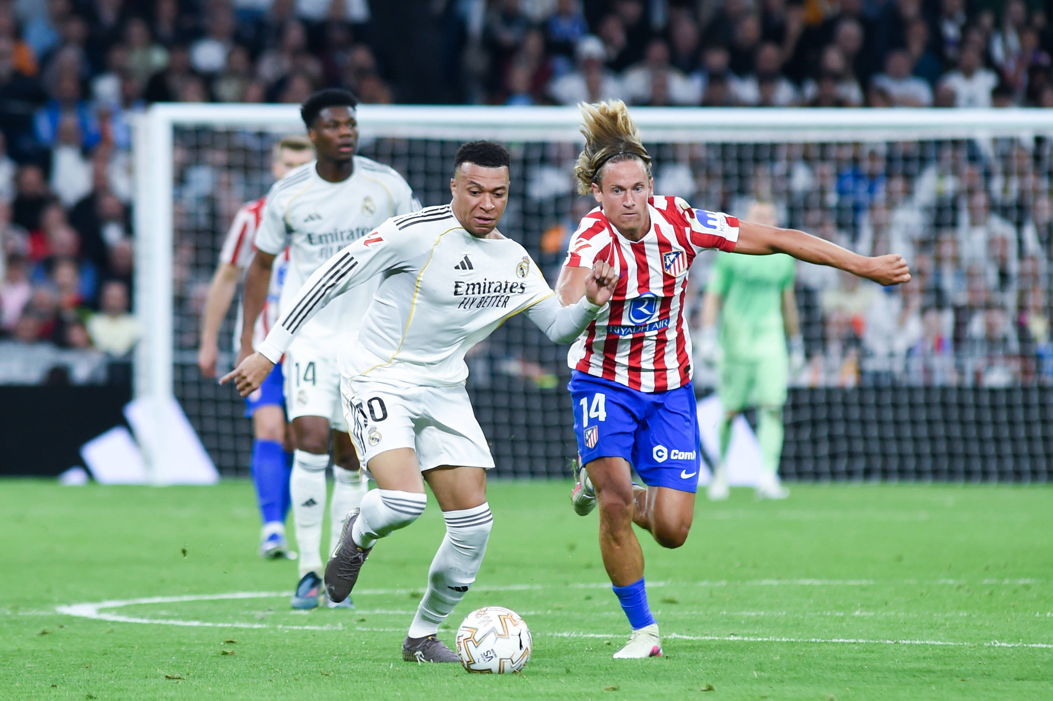 3月22日,皇家马德里队球员姆巴佩(左)与马德里竞技队球员略伦特在比赛中拼抢。新华社发(古斯塔沃·巴连特摄)马竞在上半时第33分钟先声夺人,由卢克曼禁区中路推射破网。易边再战,皇马在3分钟内连入两球将比分反超。第52分钟,汉茨科禁区内放倒布拉欣·迪亚斯送出点球,维尼修斯主罚命中。随后,巴尔韦德抓住对方后防线配合失误,禁区右路断球后捅射球门远角得手。